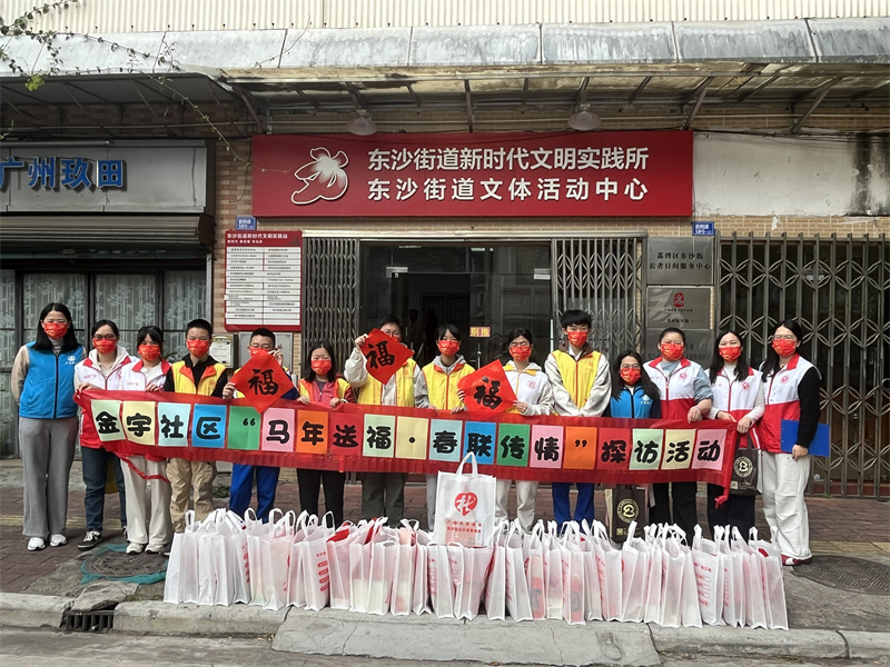 金宇社区为了迎接新春佳节,营造浓厚的节日氛围,2026年2月4日至7日,东沙街“双百工程”社工站组织开展了“马年送福·春联传情”社区探访活动。在春节来临之际,社工带领经过系统培训的青少年志愿者,分组深入金宇社区,为特困、低保、残疾人及高龄独居长者等百余户困难家庭,送上了由辖区书法班老师亲手挥毫书写的、寓意吉祥的春联与“福”字,以及精心准备的小礼品,将党和政府及社会的温暖与关怀切实送至居民家中。